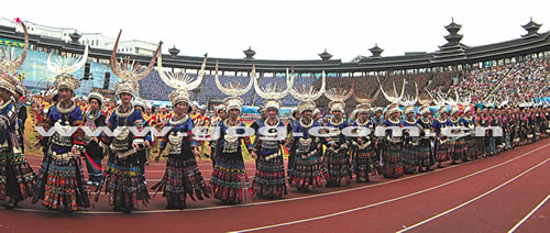 黔东南的村村寨寨沸腾了!凯里市街道上鲜花点缀,各族群众穿上最隆重的节日盛装。7月23日上午9时,万只白鸽从凯里市民族体育场腾飞,苗侗儿女敲响360面木鼓,场内顿时成为欢乐的歌舞海洋,共祝首届中国·贵州·凯里原生态民族文化艺术节开幕。