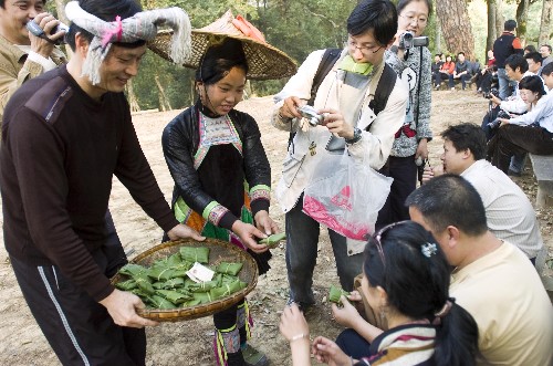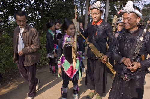 11月15日,游客在从江县岜沙村体验苗族民风民情。