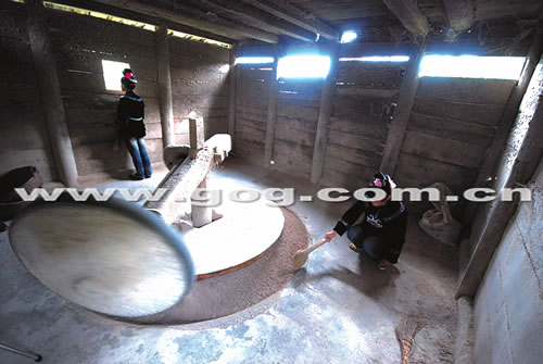雷山县丹江镇乌东苗寨有两座古老水碾坊,全寨苗族同胞用来加工大米等粮食。虽然寨里有电力大米加工机器,但苗族同胞却钟情使用这两座老水碾坊,他们认为水碾坊加工出来的大米质量、口感好,用糠喂猪猪喜欢吃,省电又环保。图为8月10日,苗族同胞在雷山县丹江镇乌东苗寨水碾坊里加工大米。