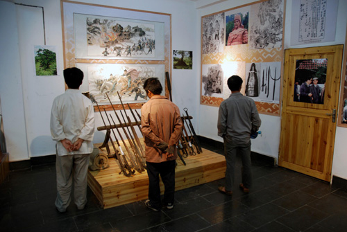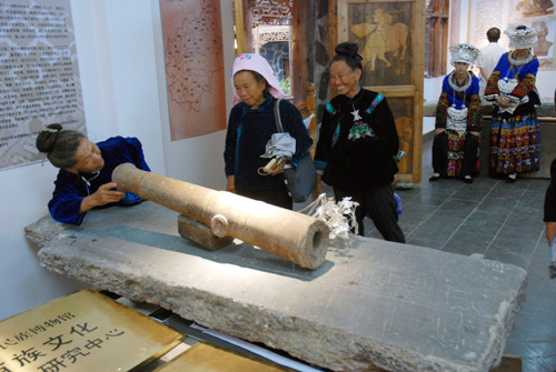 9月25日,参观者在雷山县西江镇西江苗族博物馆观看展品。