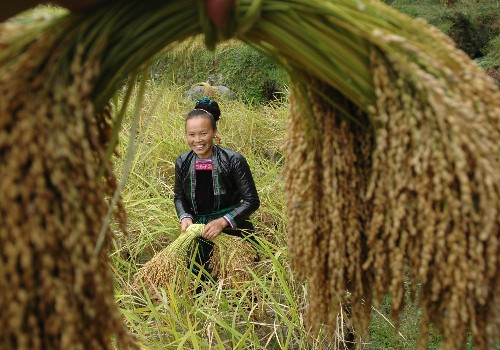 10月13日,贵州从江县高增乡的侗族农民抱着丰收的香禾糯笑逐颜开。