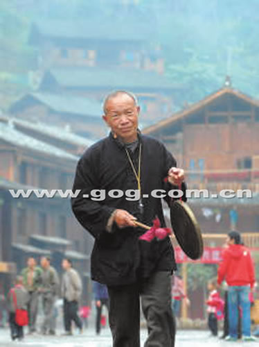 10月29日,一名消防志愿者在西江苗寨内鸣锣喊寨,提醒大家注意防火。村寨鸣锣喊寨以防火防盗的行当在消失了多年后,又在雷山县西江千户苗寨重新兴了起来。西江苗寨民居多用木头建造,为防止火灾,西江成立了贵州第一支农村少数民族消防志愿服务队,配备了消防机动泵、水带等设施,并每天坚持开展鸣锣喊寨。