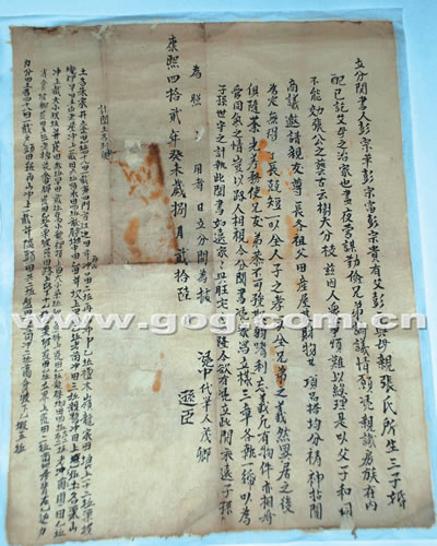该《分家契》立于康熙42年癸未歳八月二十六日,用毛笔书写、字迹清晰,内容写有彭氏三兄弟分家的原因、房屋财产的分配、山林田土的分配等,内容翔实,逻辑清晰。该文书的发现对研究剑河社会历史变迁,深入挖掘剑河县苗侗民族文化和研究开发剑河县民族民间文化旅游具有十分重要的意义。