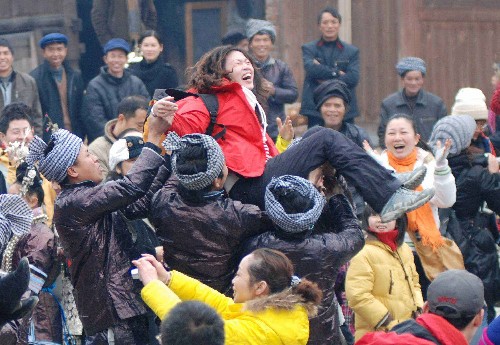 ¡¡¡¡1ÔÂ29ÈÕ£¬ÓοÍÔÚǶ«ÄÏÖÝ´Ó½ÏØ¸ßÔöÏçС»Æ´åÓë¶±×å´åÃñÁª»¶¡£