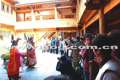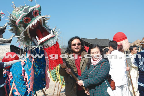 游客在古城过一把舞龙瘾。春节期间,锦屏县隆里古城每天都有舞龙、演汉戏等传统民俗文化活动,5000多名游客走进“汉文化孤岛”隆里,体验明代军事城堡的古风古韵。