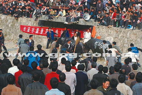 据目击者介绍,当日是一年一度的舟溪芦笙会最热闹的一天,按照惯例,参加斗牛比赛的水牯牛将在甘囊香芦笙堂河滩坝边轮番登场进行比拼。下午3时许,两头剽悍的水牯斗牛登场后,便厮打起来。数以万计的观众,有的站在河坝上远观,有的则围拢在河滩边近观。