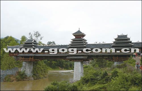 地坪风雨桥坐落在黎平县城南108公里处的地坪乡,它始建于清光绪八年(1882年),桥长56米,宽4.5米,飞架南江河,桥身距正常水位10.75米。整座桥梁运用杠杆力学原理,大小柱、枋、檁、凳、杆栏全部用杉木凿孔穿榫构成,不用一钉一铆,造型优美,结构严谨,工艺精湛,雄伟壮观,造型结构居全国之首,每年吸引无数游客到此参观考察。