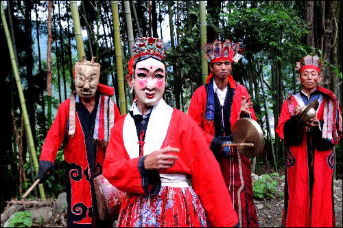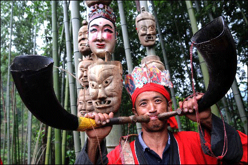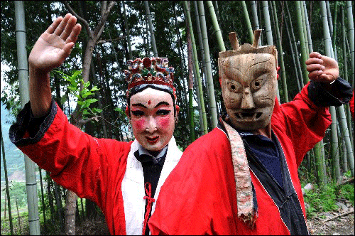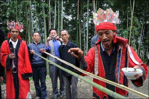 贵州岑巩民间傩戏艺人在竹林间进行喊竹表演。