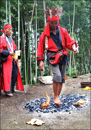 贵州岑巩民间傩戏艺人在竹林间进行过火海表演。