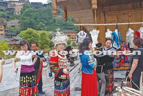 据介绍,端午小长假西江每天接待游客逾1万人次,主要以团队为主。团队主要来自上海、北京、香港、浙江等省市,外国团队也大幅增加,主要有法国、英国、新加坡、奥地利等国家。图为游客身着苗族服饰留影纪念。