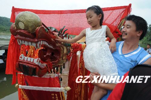 617,苗族群众抱着孩子抚摸参赛的独木龙舟,以求安康好运。