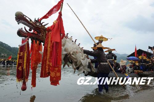 2009617,苗族群众将鸭子送给本村寨的独木龙舟组,为独木龙舟竞赛鼓劲加油。当日是农历五月二十五,在贵州省台江县施洞镇清水江畔,来自施洞镇周边数十个苗族村寨的众多苗族同胞欢聚一堂,开展龙舟竞渡,欢度当地的传统节日独木龙舟节。独木龙舟节每年农历五月二十五开始,持续3天。