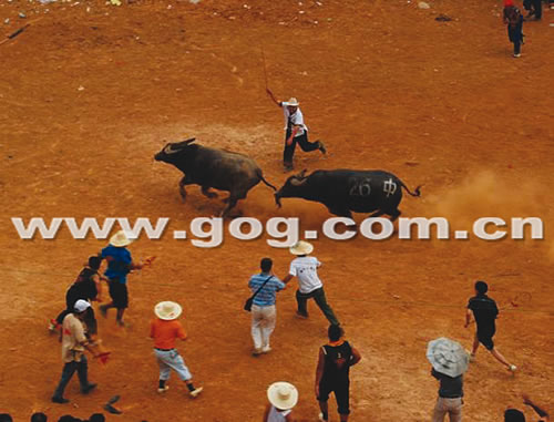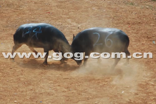 两牛展开决战时,“草上飞”不忘发挥优势,举角朝“麻江六宝”碰将过去,“麻江六宝”勾头迎战,很轻松地接了对方的招,接着它抡角进行反击,抠住了对方的左眼,“草上飞”惊慌失措,奋力挣扎,企图尽快脱身,“麻江六宝”不依不饶,奋力作战,抠挑并用,不给对方喘息和挣脱的机会,“草上飞”无法脱身,最后被掀翻在地。