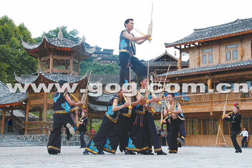 雷山县丹江镇排卡村芦笙制作已有400多年历史,是芦笙制作之乡。该村80户人家中已有12户是芦笙制作专业户,年加工芦笙近万支,产值30余万元,被誉为“芦笙制作第一村”。图为苗族小伙演奏芦笙。