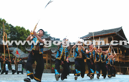 雷山县丹江镇排卡村被誉为“芦笙制作第一村”,该村的芦笙制作已有400多年历史,是芦笙制作之乡,这里的芦笙做工精湛,音色素雅,音质圆润,远近闻名,赢得了国内外商客的青睐,许多工艺品商店和旅游景点上门订制,芦笙远销四川、广西,甚至卖到了美国。目前,该村80户人家中已有12户是芦笙制作的“专业户”,芦笙制作年加工量近万支,户均收入1万元以上。图为苗族小伙在台上表演芦笙吹奏。