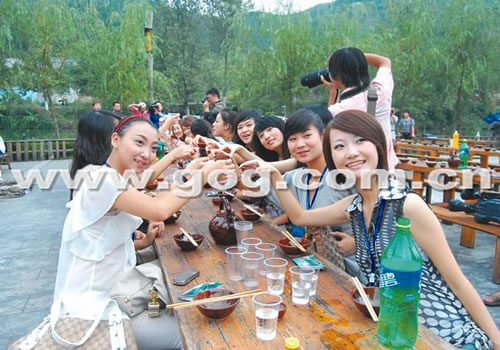 9月3日下午,参加“世界小姐”选拔大赛贵州赛区比赛的30名选手走进位于凯里白果井的“侗家寨”感受浓郁的侗族风情。侗家寨拿出看家本领——侗家长桌席,款待了这群美丽的姑娘。姑娘们喜不自胜,拿起酒杯,喝起了香甜的米酒。据悉,本次大赛贵州赛区有30名选手参赛,多数来自我省,都是经过层层选拔产生的。