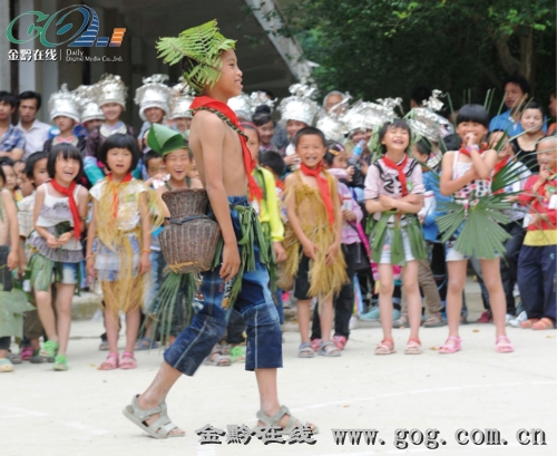 “六一”期间,一个小学生身穿粽叶自制的服装走起猫步,引得同学们开怀大笑。当天,黎平县龙额乡六甲小学学生用粽叶、芭蕉、茅草、野花等山野植物做成一些奇装异服,在操场上踩着猫步走秀,开心庆“六一”。