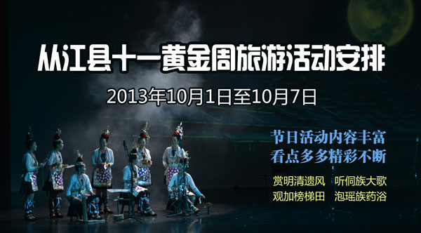 看点一:黄金周期间,从江县隆重推出“世界非遗•神秘从江”大型歌舞音画文艺专场。该场大型音画节目,是从江县倾力打造的以侗族大歌等原生态民族文化为主的一大品牌,荟萃了该县苗、侗、壮、瑶、水等少数民族绚丽多姿的民歌、民舞、民俗等地域文化特色元素。2012年曾远赴法国、美国等欧美国家的20多个城市和北京、上海、武汉、深圳等国内城市巡演数十场,深受好评。其中,侗族大歌、岜沙成人礼、斗牛等歌舞节目还分别荣获国家级大奖,演出民族特色浓郁,精彩纷呈。