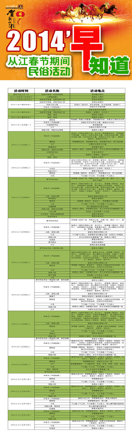 贵州旅游在线讯 2014年的马年,从江县推出了诸多民俗活动。届时,游客可在从江感受最原始、最热闹、最原生态的民俗活动。活动内容详见下表: