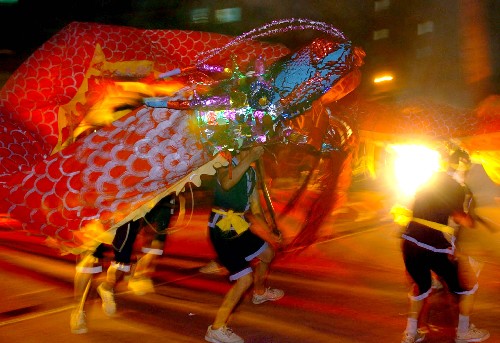 9月18日凌晨,布依族群众在贵州平塘县平湖镇的水龙节上舞龙。