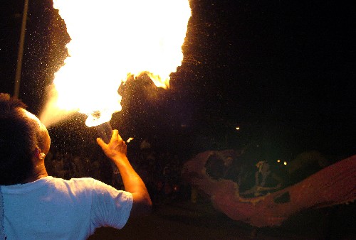 一名民间艺人在贵州平塘县平湖镇的水龙节上表演“喷火”。