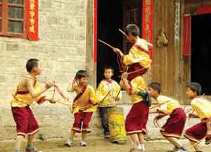 猴鼓舞是平塘县卡蒲毛南族独特的民间舞蹈,是4月28日“玉水不夜天”——中国·平塘国家地质公园民族风情旅游节活动中卡蒲毛南族风情园开园仪式的一个亮点。该舞蹈分为“猴王出世”、“猴子敲桩”、“猴子引路”三部分,表演时,一人击铜鼓,一人击皮鼓,多人表演,动作滑稽、诙谐,全是模仿猴子的,其内容丰富,舞姿独特,被誉为舞蹈中的“活化石”。图为该县卡蒲毛南族乡的小演员们正在加紧排练,以使游人在此次活动中一睹猴鼓舞的风采。
