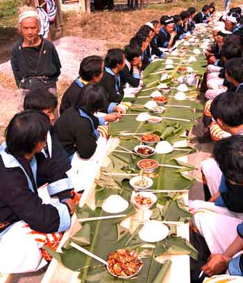 “瑶王宴”是瑶族的一个民间传统,每遇到红白喜事时,全寨男女老少都集中吃“瑶王宴”。“瑶王宴”是瑶族同胞同甘共苦的一种象征,哪家死了人、遇了难或结媳妇、嫁姑娘,全寨每户就拿出一张方桌,四盘菜肴,四斤米酒,四对碗筷,四个酒杯,集中到寨子中央,摆开连席,协助主人家招待亲朋,同时一家派出一人参与共宴,陪来客喝酒。一般全寨人都参加,以摆100张桌子为顶点,每张桌子座4人,共400人,如超过400人,就另外摆第二“席”。