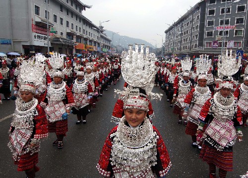 当日,贵州省剑河县举行仰阿莎文化节开幕仪式,民族盛装展示巡游、多彩民族风情文艺展演及苗歌比赛等活动吸引众多游人。