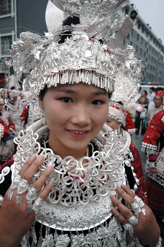 10月4日,一位苗族女青年展示民族服饰。