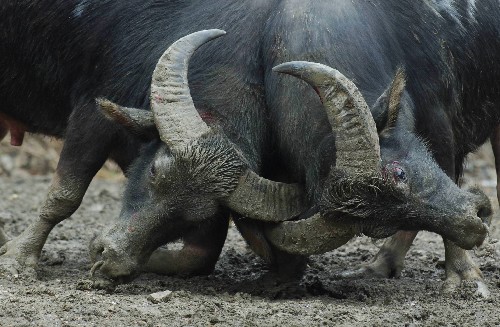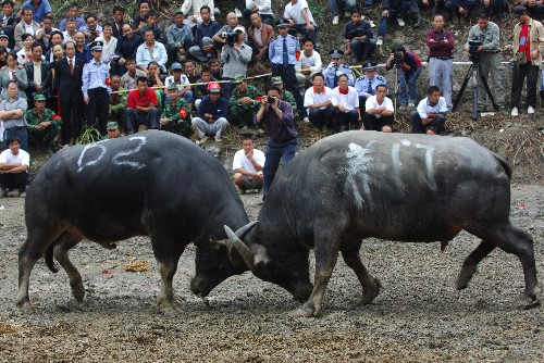 10月4日,在贵州剑河举行的仰阿莎文化节“牛王”争霸赛中,两头斗牛进行激烈角逐。为期两天的仰阿莎文化节“牛王”争霸赛10月4日至5日在贵州省剑河县举行,吸引了众多各族群众到场观看。