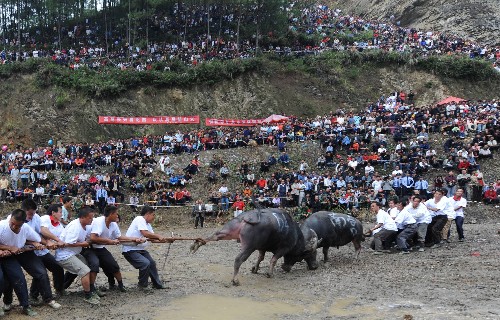 10月4日,在贵州剑河举行的仰阿莎文化节“牛王”争霸赛现场,工作人员用绳索拉开两头斗红了眼的斗牛。