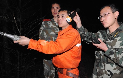 2009年2月25日晚,在贵州龙里县龙架山国家森林公园火灾现场,消防官兵用水枪灭火。