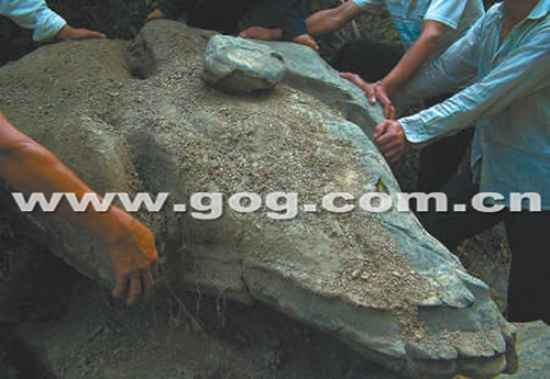 民工们在清理碎石的现场,还同时发现一块巨大的“怪石”,“怪石”像一只大乌龟,身上不但长了翅膀,而且尾巴上还长有分层的鳞片,七八个人都抬不起来。大家现场给这块“怪石”取名“神龟”。