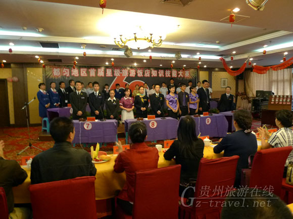 9月29日上午,在五月花景山酒店会场,都匀地区星级宾馆、酒店在此展开了一场迎国庆,展星级酒店风采技能大赛。贵州省旅游局纪检组长李光一行到会祝贺,黔南州委常委都匀市委书记高金林、黔南州旅游局局长伍晓红、都匀市副市长蒙力、市委宣传部长谷华到场观看比赛。李光为一等奖获得者桥城宾馆颁奖,都匀市委书记高金林为二等奖贵侯苑商务酒店颁奖。比赛决出了:一等奖、二等奖、三等奖、优秀奖等。 裴建军 文/图