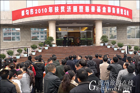 2010年1月29日下午,在都匀市人民政府大楼门前举行向扶贫济困暨慈善基金募集捐赠活动,出席捐赠活动的有:都匀市四大班子的主要领导,都匀市各个局单位领导,都匀市旅游局也向扶贫济困献出了爱心捐赠人民币1000元。同时,旅游局全体干部共捐赠物资折合人民币1800元。现场场景充分体现了“一方有难,八方支援”。