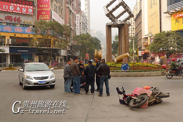 本网讯 11月21日上午十时左右,一辆银灰色丰田轿车与一辆摩托车在都匀大十字转盘处发生冲撞。