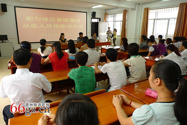 贵州旅游在线讯 为巩固中国优秀旅游城市的复核,近日,都匀市文体广电旅游局会同黔南州民族师范学院教授,在该院举办都匀所属星级酒店服务人员应知应会技能培训班开班,参加此次仪式的有10家星级酒店200余名服务人员,这10家星级酒店的服务人员在老总们的带领下认真听课、深刻领会酒店服务的原理。据通报,此200余名服务人员也是第一次参加这种形式的培训班,都匀市文体广电旅游局将在下几个月陆续开办这种类型的培训班,迎接国家旅游局对星级酒店的复核。