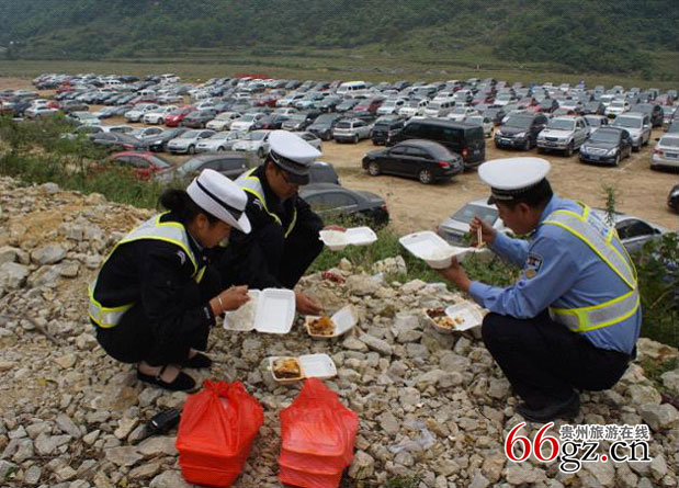 国庆期间值勤民警在小七孔景区临时停车场吃盒饭