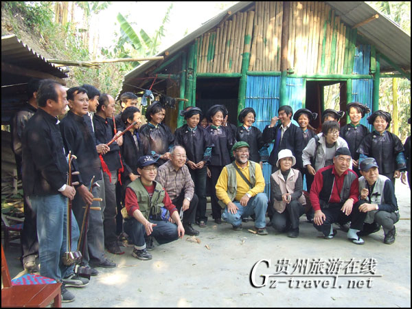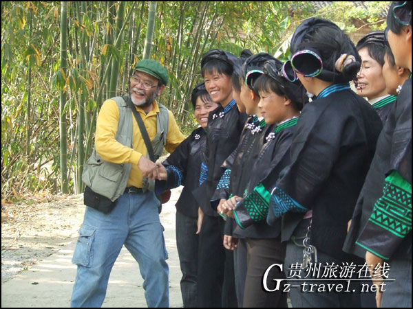 在坝盘村,一进寨口,他就被全来迎接的热情的村民、寨内原始古朴的自然风光以及浓郁的布依风情所感染,高兴得手舞脚蹈,情不自禁的操起小铙钹,为村民演奏的古乐八音伴舞,与布依姑娘一起合唱“安龙安龙、十里荷花安龙,安龙安龙、如诗如画安龙……”。跟随他的那些“长枪短炮”也拍过不停。古榕树下、吊脚楼旁、田间路上,留下了一副幅美丽如诗的动感画面。摄影师一边拍一边不停的说:“哟西哟西”。离开时,团侍郎向村里赠送他为贵州创作的歌曲dvd光碟,并拿出100元钱请接待他的村民喝酒,然后才与村民们依依挥手惜别。
