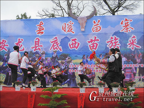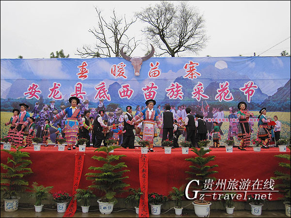 下午2时30分,文艺演出在礼炮和唢呐声中拉开序幕,声声礼炮和唢呐吹响了春天到来的号角,接着欢快明亮的器乐合奏《苗岭圆舞曲》拉开了节日喜庆的场面。随后舞蹈《采花舞》、《苗韵》、《芦笙舞》、《绣荷包》、《苗族板凳舞》、《鲁角》,歌伴舞《太阳鼓》,小品《布依山寨四老头》,独唱《贵州人》、《山丹丹花开红艳艳》、《苗家酒歌》,口琴演奏,苗族绝技表演等17个节目闪亮登场。一个个节目精彩纷呈,身着五颜六色服饰的苗家儿女在优美动听的乐曲声中翩翩起舞,尽情歌唱,现场掌声和欢呼声一浪高过一浪,黔西南州、安龙县领导及周边县市、乡镇和村寨的5000干部群众现场饱赏了浓郁的苗族风情和多彩的苗族文化大餐。
