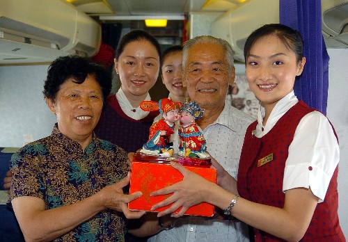 8月17日,“红色旅途”乘务组乘务员在向一对老夫妇赠送纪念品。
