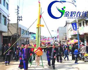 10月29日,6名苗族同胞抬着号称世界“芦笙王”的大芦笙,在黄平谷陇农历九月二十七芦笙会上游行。当天首次向公众亮相的这把“芦笙王”,管长9.28米,斗长2.7米,为当地苗族同胞制作的最大一把芦笙。