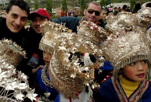 11月17日,几名意大利游客在黔东南苗族侗族自治州和苗族群众联欢。