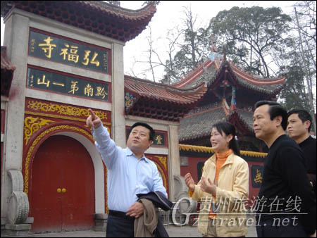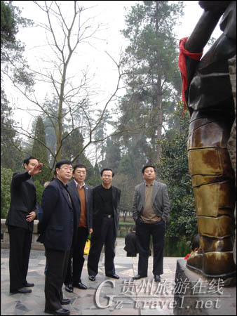 图为省旅游局副局长傅迎春(左一)陪同海南省政府副省长陈成(右一)考察国家级4a级景区黔灵公园。