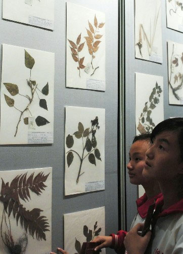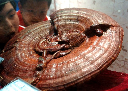 5月21日,几名学生在贵阳药用资源博物馆内观看一个巨型灵芝。