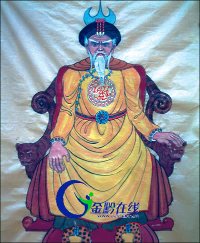 居住在镇宁革利一带的“古董苗”自称夜郎王后裔,出于对祖先的尊敬,根据关于竹王的传说,于前不久画出了他们的祖先竹王的画像。他们称,这张竹王画像就是夜郎王多同的画像(如图)。