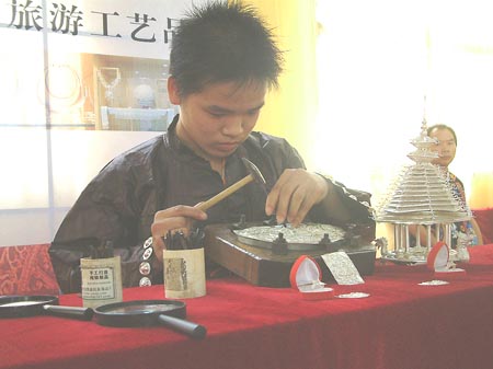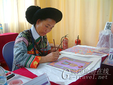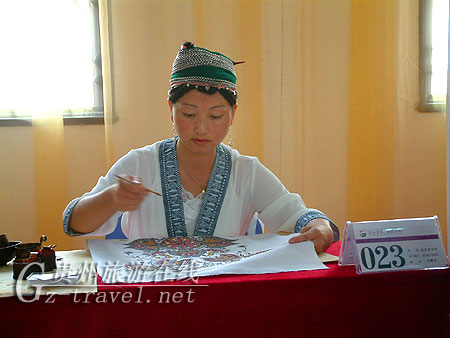 展厅中展出的有苗族蜡染、刺绣,侗族的琵琶,来自安顺的木雕等等众多工艺品。参展的各个少数民族代表们都带上工具,在这里现场制作。他们精湛的工艺深深吸引了来自海内外的宾客,让他们在这里久久流连,不肯离去。