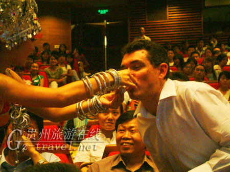 9月6日,“2006乡村旅游国际论坛”在贵阳市花溪圆满结束。当晚,已会“2006乡村旅游国际论坛”的专家学者及嘉宾们在贵阳市贵阳大剧院观看了“多彩贵州风”大型歌舞诗演出。随着悠扬的钟声响起,台上歌悠悠、舞飞扬,台下掌声如涛声连绵不绝;苗族姑娘们献上的甘甜米酒,使到场的每一位嘉宾充分感受到贵州苗乡以酒敬宾的热情。无论是歌、还是舞、就象姑娘们敬上的美酒,久久让人回味。