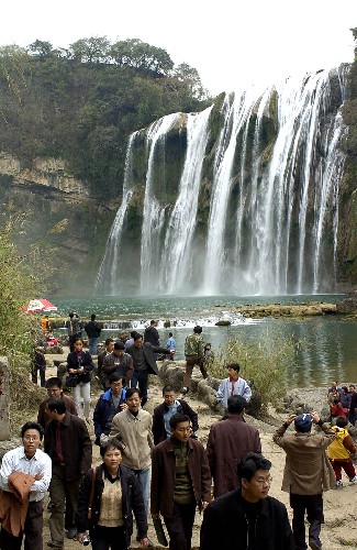 游客在贵州著名旅游景点黄果树大瀑布游览。