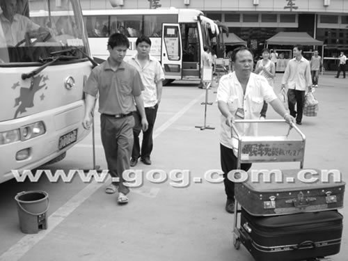 ¡¡¡¡Í¼Îª¹óÑô¿Í³µÕ¾¹¤×÷ÈËÔ±ÕýÔÚʹÓÃÐÐÀîÍÆ³µ°ïÖúÂÿ͡£
